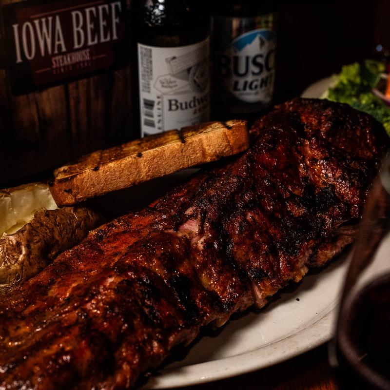 The Iowa Beef Steakhouse was established in 1982 by Henry Schnieder. Iowa Beef Steakhouse is known for serving huge choice cuts of steak cooked over charcoal, fantastic sides & offering a large selection of drinks from their full bar. The wood in the restaurant, most of the decor & items on the walls came from a barn in Southern Iowa.